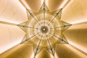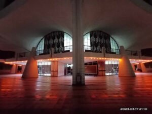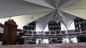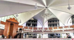 للمسجد مدخلان، أحدهما من موقف السيارات في الجهة الشمالية مع منحدر، أما المدخل الرئيسي فيقع في الواجهة الشرقية. عندما يدخل المرء قاعة الصلاة، سوف يندهش من المساحة المضلعة الضخمة والمفتوحة والمضاءة بسخاء مع إطلالة 360 درجة على المناطق المحيطة، وذلك بفضل الجدران الزجاجية. ومع ذلك، تم تعديل هذه الجدران جزئيًا باستخدام شاشات خشبية منحوتة تلقي أنماطًا جذابة من الظلام والضوء في القاعة. يتم استخدامها أيضًا كقواطع لتوفير الخصوصية للمعارض النسائية المرتبطة مباشرة بالشرفات المحيطة. توفر الفتحات الشاملة مداخل ومخارج للتهوية الطبيعية الكافية، مما يوفر بيئة داخلية مريحة حرارياً. داخل قاعة الصلاة هذه، يرتفع هيكل المحراب ذو الشكل الجريء والمنحوت عموديًا ويخترق المعرض أعلاه.