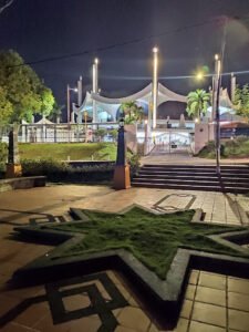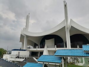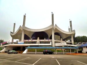 إن أهم السمات الرسمية والتصويرية لهذا المسجد المكون من طابقين هي تلك الخاصة ببنيته الخرسانية. والمسجد على شكل مضلع ذو تسعة جوانب يعلوه شكل السقف المظلي. تمثل الجوانب التسعة مناطق الولاية التسع وأصل اسم الولاية. سقفها المظلي عبارة عن هيكل خرساني مقعر زائدي الشكل مثبت بتسعة أبراج. هذه الأبراج هي في الواقع مآذن، يعلو كل منها نجمة وهلال، رمزًا للإسلام. إلا أن هذه المآذن تعتبر ثانوية. تم بناء المئذنة الرئيسية بشكل منفصل ومنفصل عن المبنى الرئيسي. في الطابق الأول، تم دعم المدرجات الخارجية المحيطة بالمبنى بتسعة دعامات مخروطية الشكل ترتفع من مستوى الأرض.